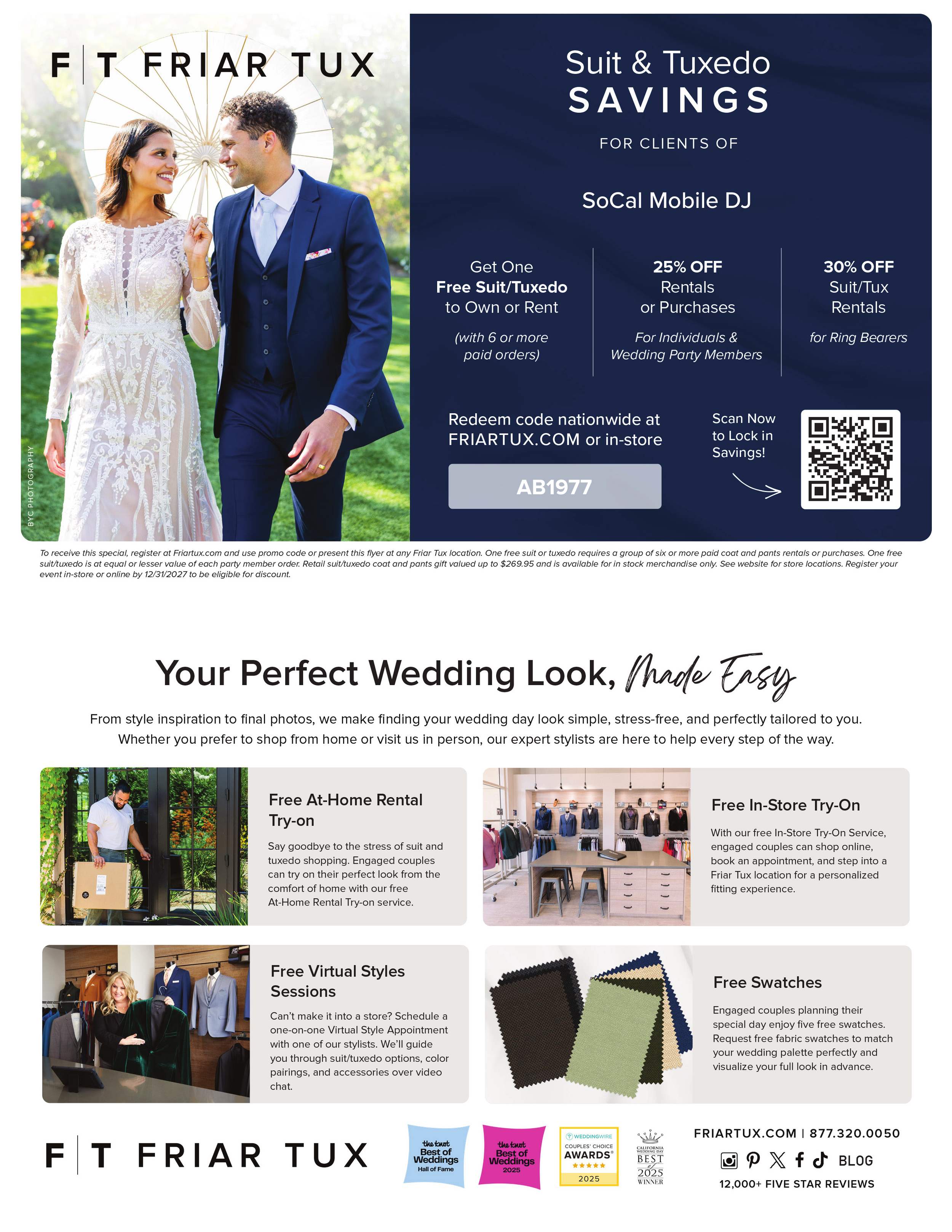 “We’ve partnered with Friar Tux to offer our couples exclusive 2026 savings on suits and tuxedos—making wedding attire simple, stress-free, and affordable.”